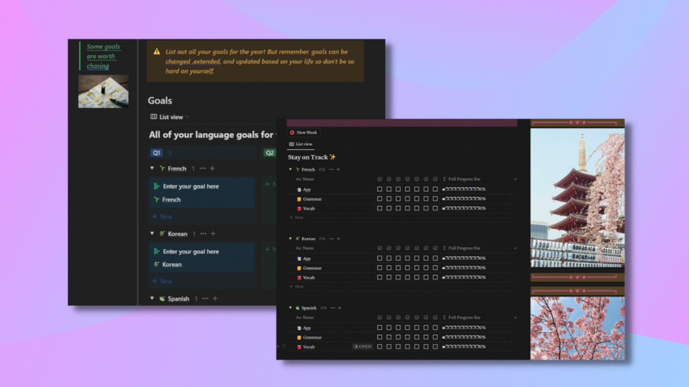 Welcome to my brain. This language learning template will help you plan and keep track of your learning goals with tools like a goal tracker, weekly progress bar, and a to-do list!
