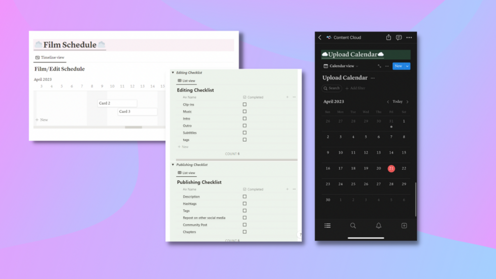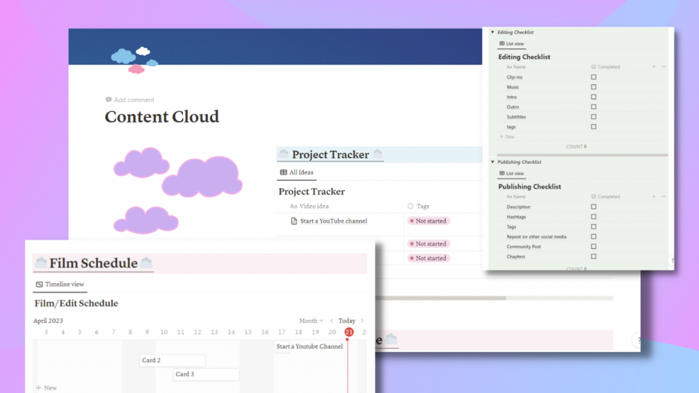 Progress Tracker, Film schedule, Video breakdown template, sponsorship organizer, Brain dump page, and upload calendar.